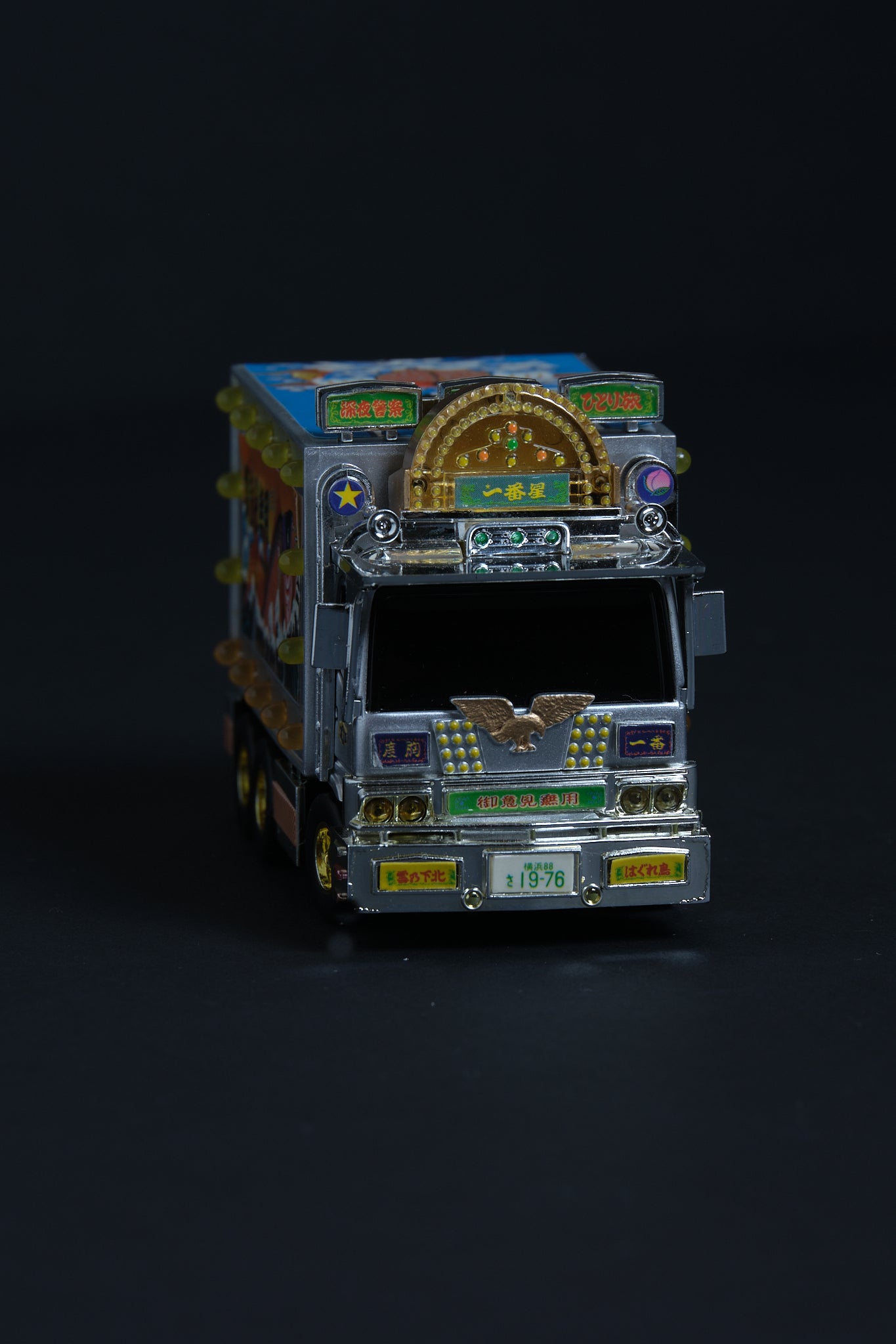 POPY × SKYNET (2005) miniature inspired by "Truck Yaro: Totsugeki Ichibanboshi." Includes motorized drive and light-up functions that bring the deko-truck aesthetics to life.