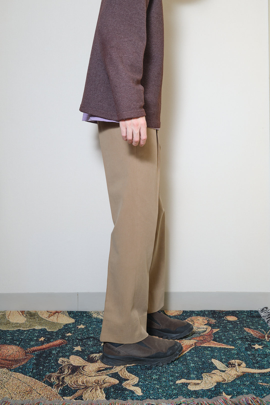 フロントは2タック仕様で腰まわりにゆとりがあり、腿から裾にかけて自然に落ちるストレートシルエット。
