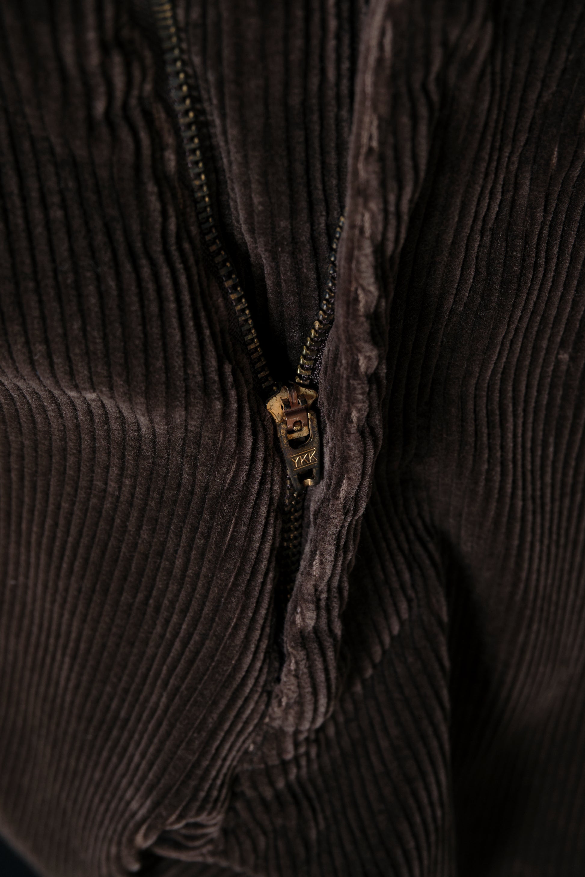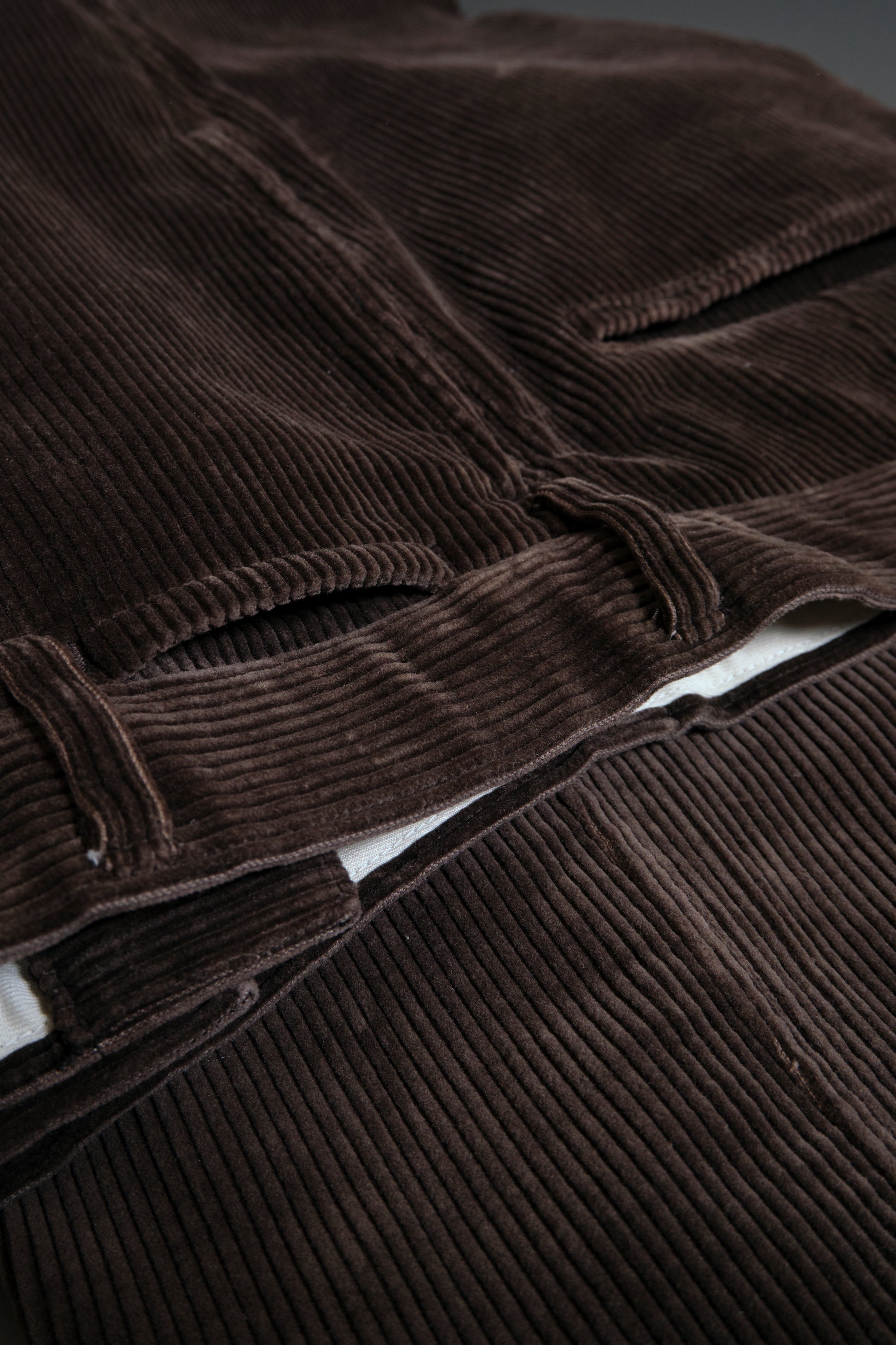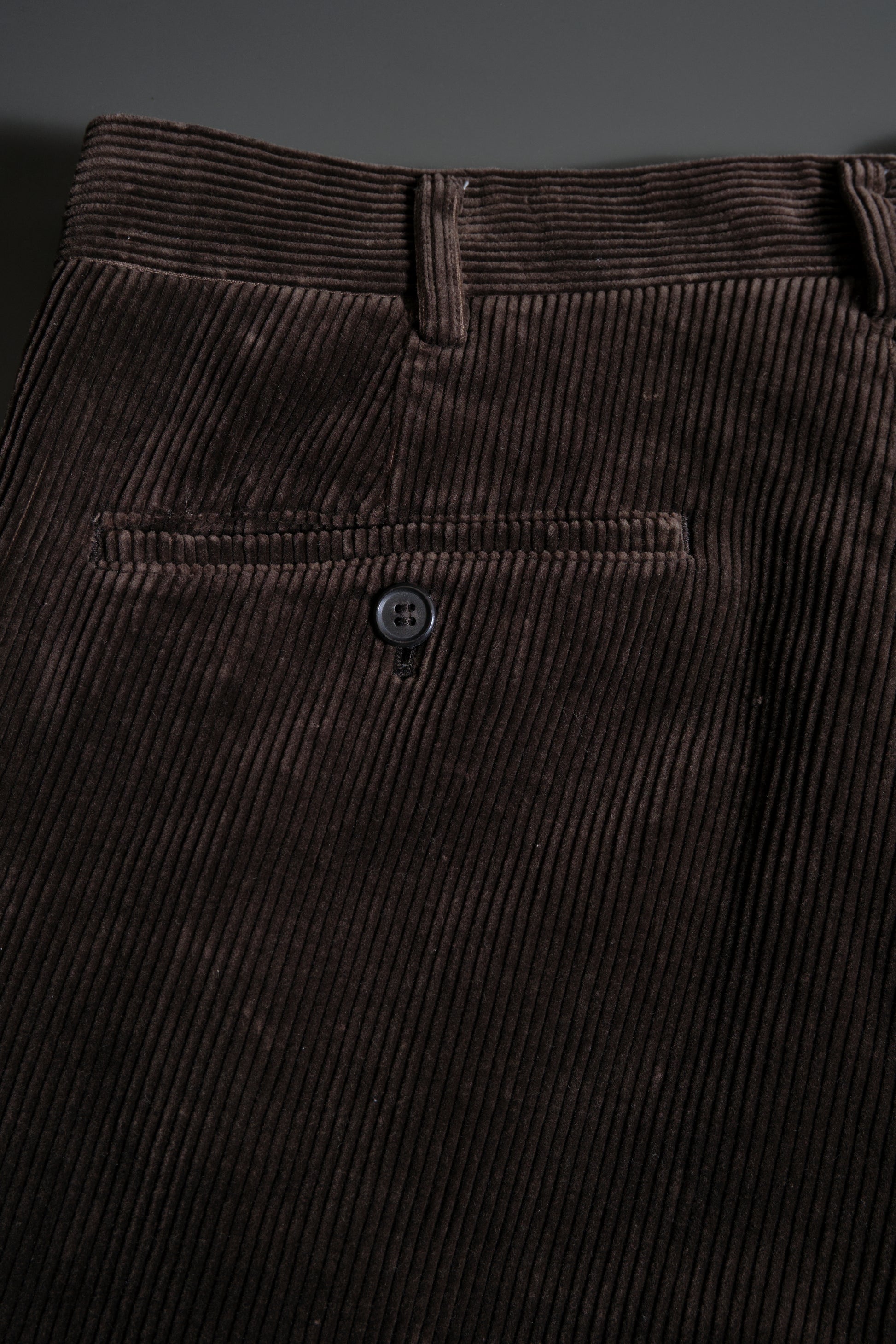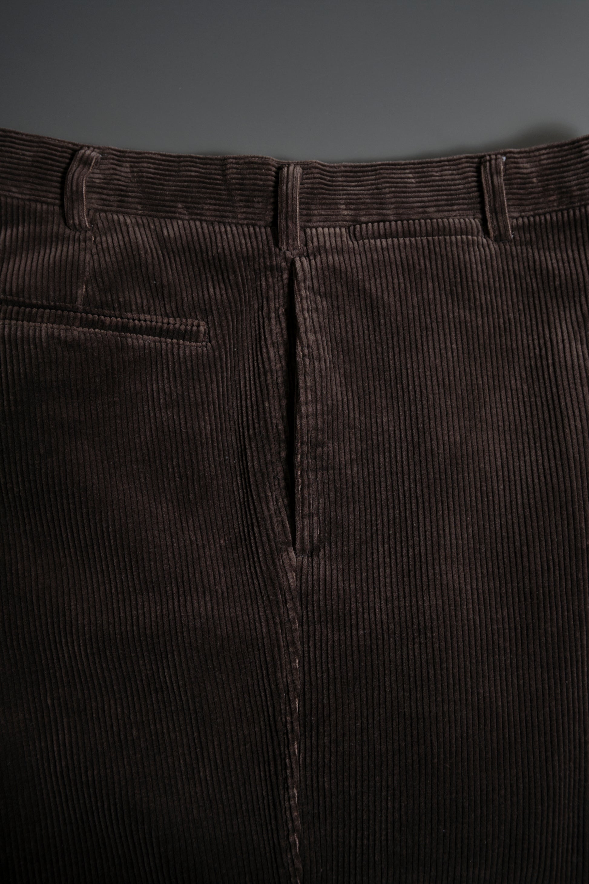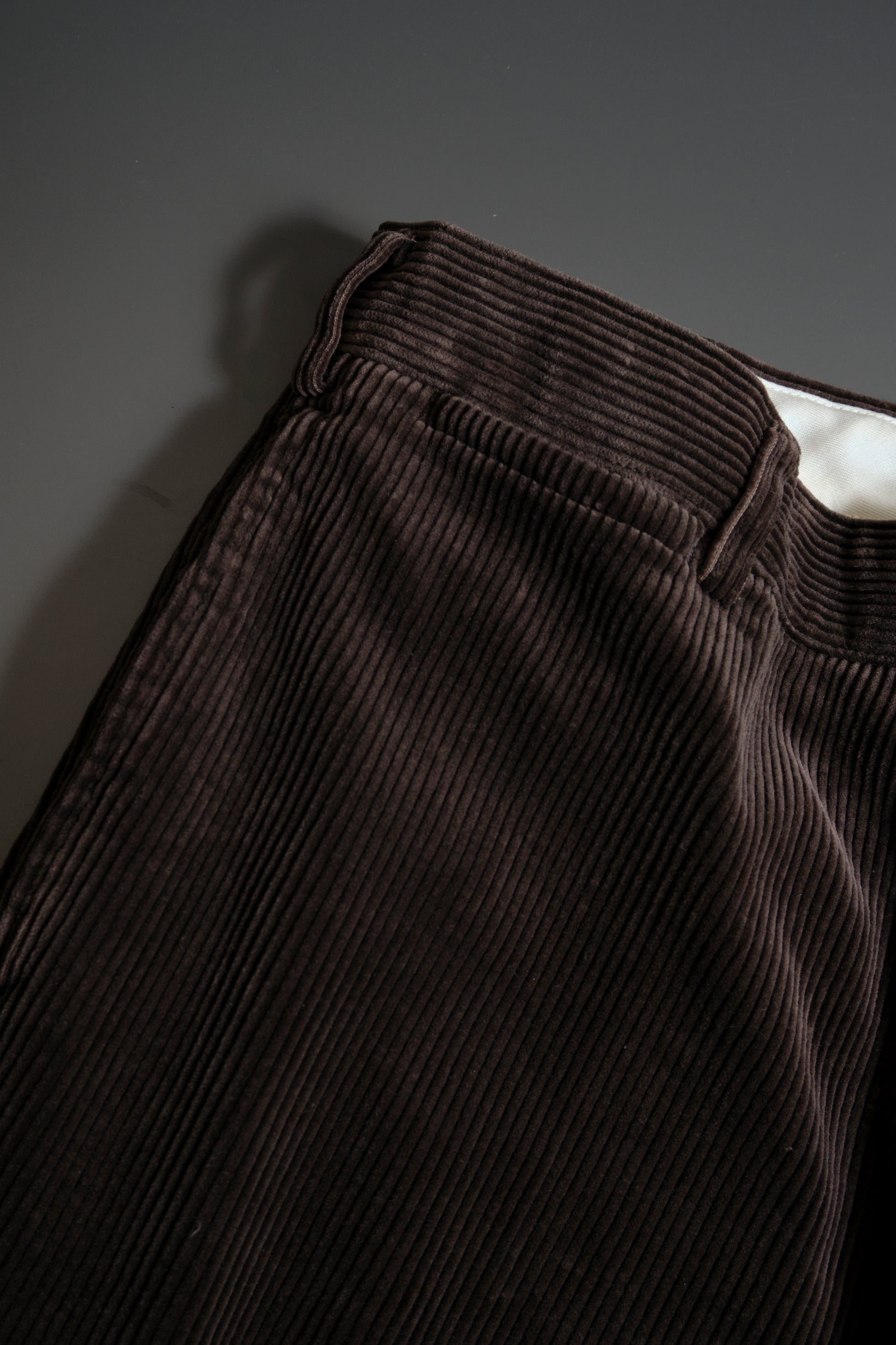 Brown corduroy slacks featuring a rich texture with well-defined ridges. Crafted in a tailored slacks silhouette, these trousers balance casual warmth with a clean, refined look suitable for everyday wear.