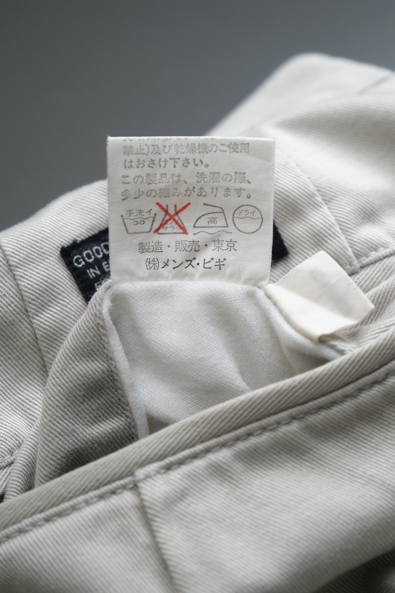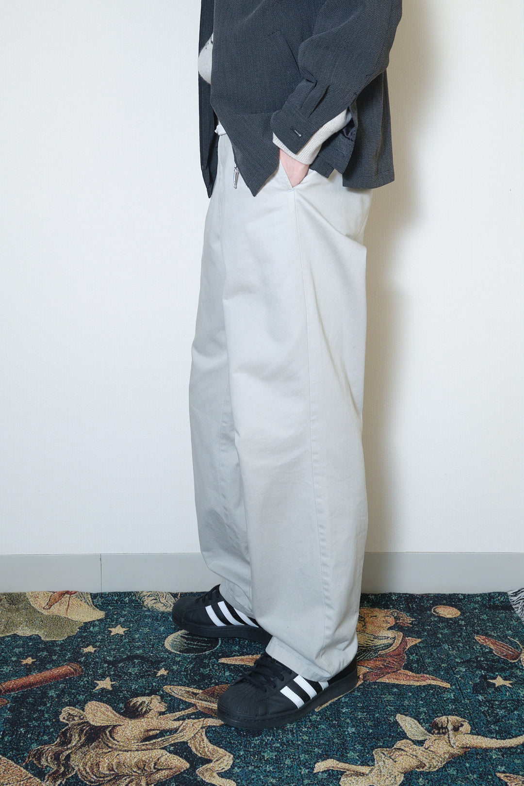 ライトグレー寄りの落ち着いたカラーのMEN'S BIGIワイドチノパン。深めのワンタックと程よいワイドストレートのシルエットで、大人らしい抜け感のある一本です。古着としての使用感はありますが、目立つダメージはなく全体的に良好なコンディションです。
